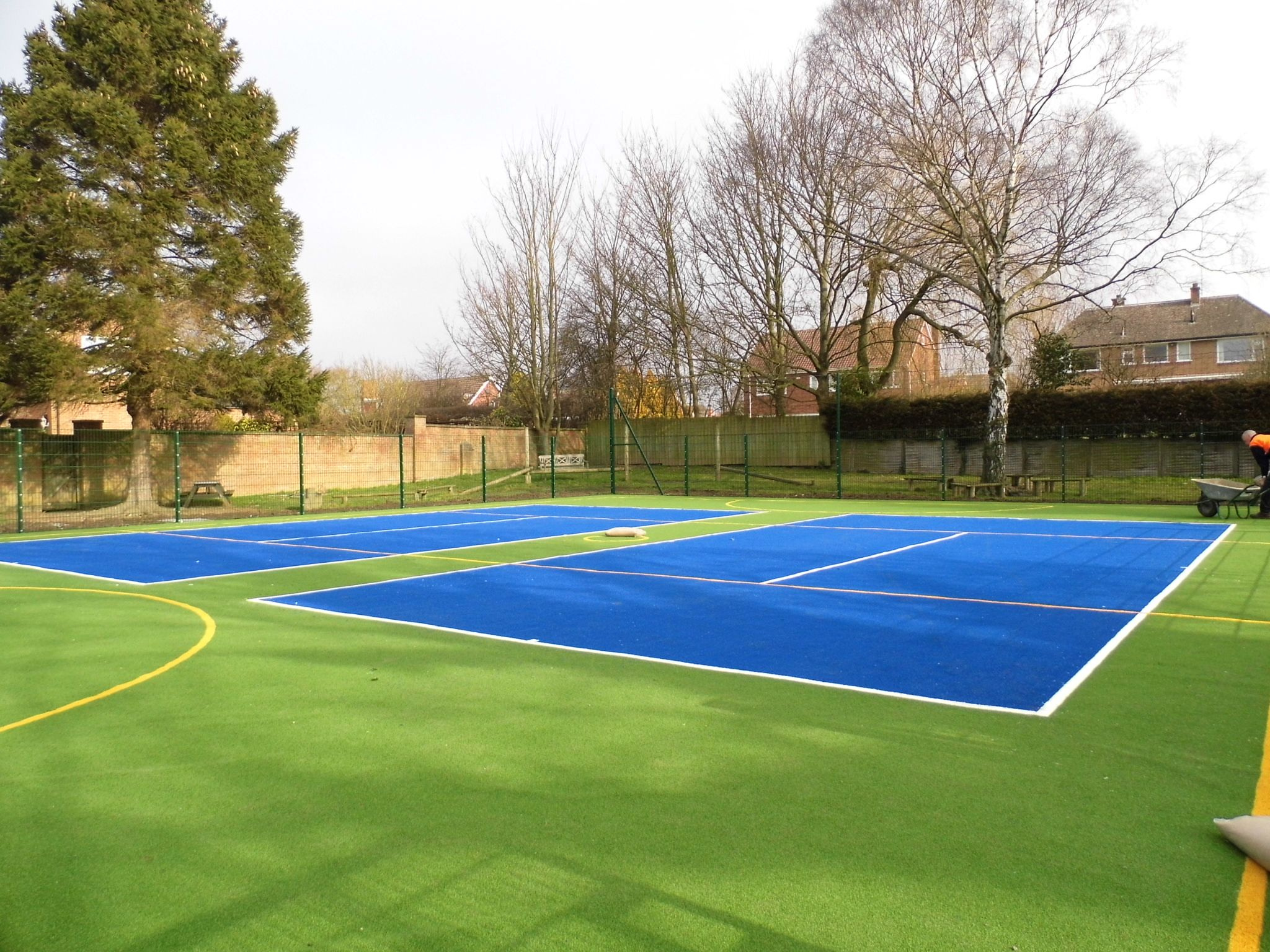 Під час облаштування тенісних кортів застосовується напівзасипний метод встановлення штучних газонів. Для засипання тенісного покриття використовують гумовий пісок та гранулят, змінюючи при цьому загальну висоту засипки. Різна висота засипки корту дає можливість врахувати рівень підготовки, а також стиль гри тенісистів, якій вони використовують у грі. Тенісні корти покривають штучною травою з ворсом, висота якого повинна бути в діапазоні 9 – 22 міліметрів.